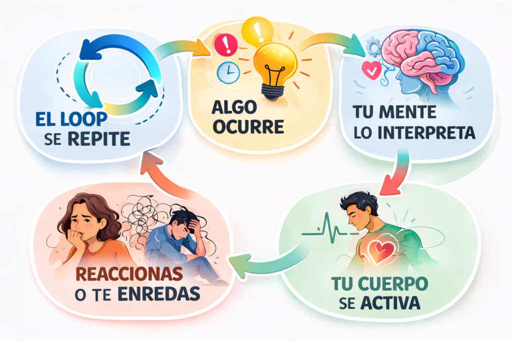 Algo ocurre → tu mente lo interpreta → tu cuerpo se activa → reaccionas o te enredas → el loop se repite
